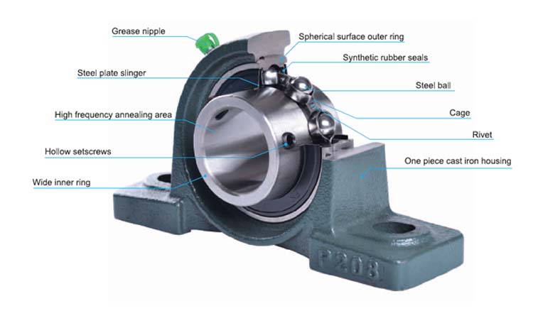 Burko-bloke errodamenduak UCP207 UCP208 Burutzeko blokea Baloia errodatzeko unitateak, oro har, petrolio froga bat gomazko zigilu sintetikoa eta errodamenduaren bi aldeetan duen xafla du.